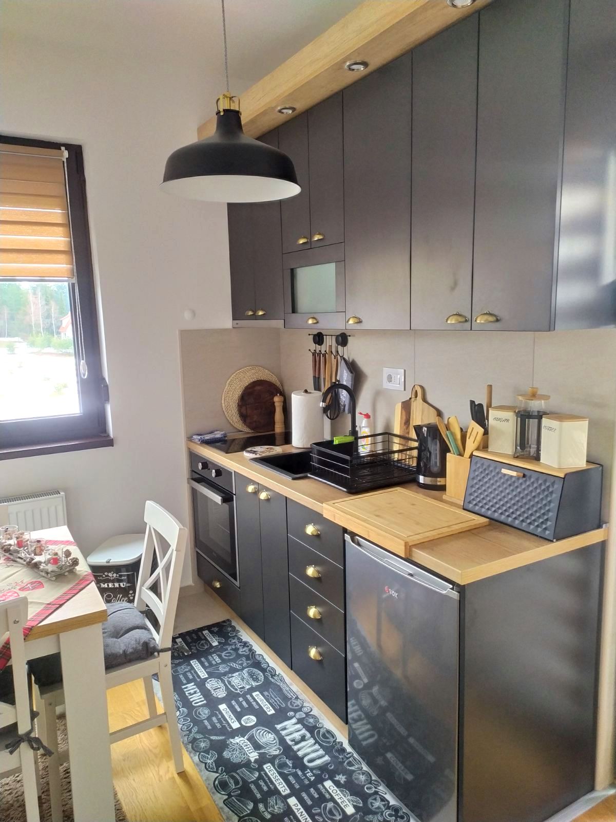 Kuhinja apartmana je potpuno opremljena(šporet sa rernom), posuđe, pribor, frižider.
