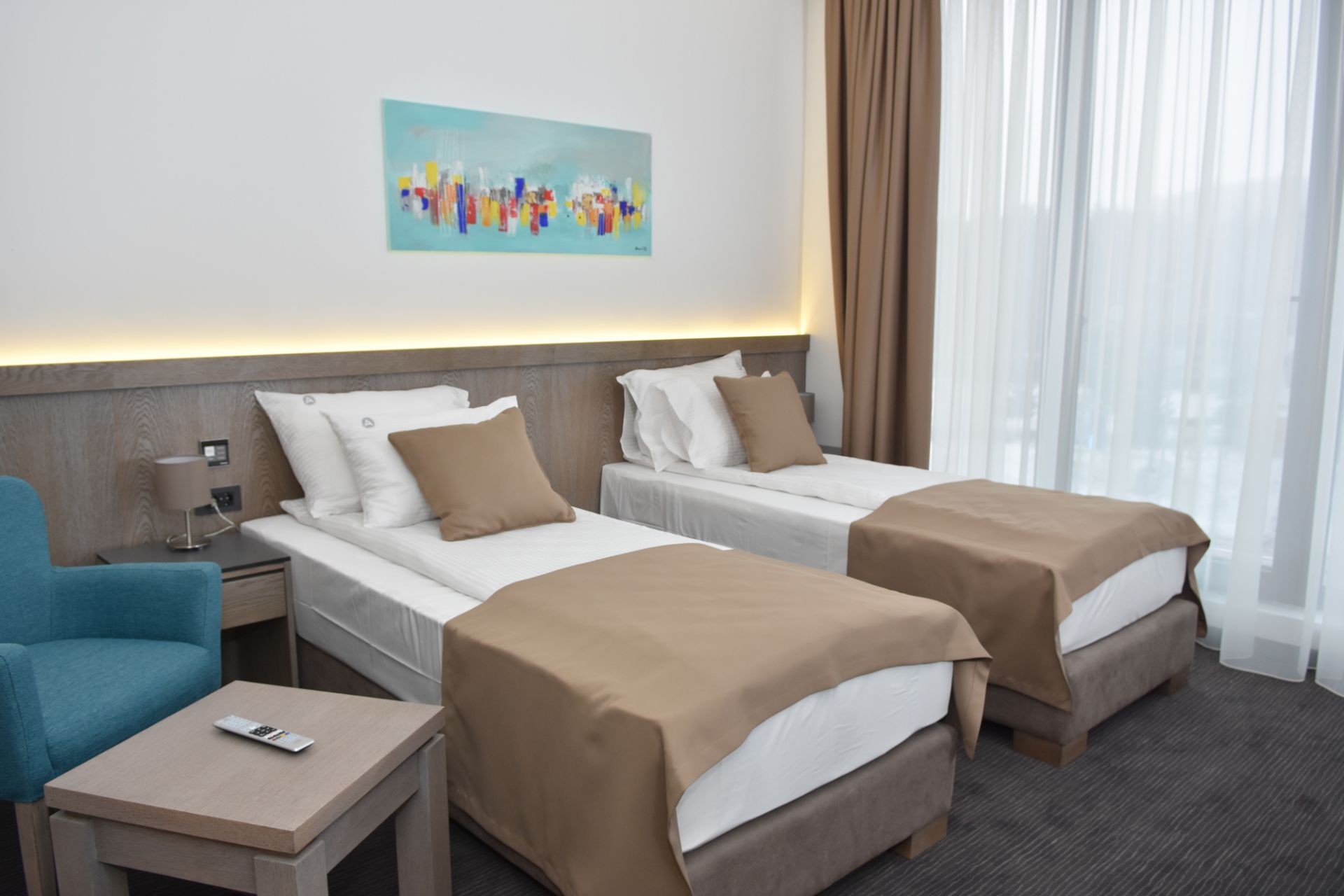Ukupan kapacitet objekta je 110 ležaja raspoređenih u 42 smeštajne jedinice, odnosno 37 soba i 5 apartmana ekskluzivno opremljenih kvalitetnim i modernim nameštajem uz implemetaciju najsavremenije hotelske tehnologije po ugledu na svetski poznate hotele. Svojom udobnošću i karakteristikama smeštajne jedinice ovog objekta odgovoriće na zahteve i najvećih hedonista. Sve sobe i apartmani poseduju TV sa ravnim ekranom i kablovskim kanalima, bežični internet i mini-bar. Gostima je na raspolaganju i rum servis.